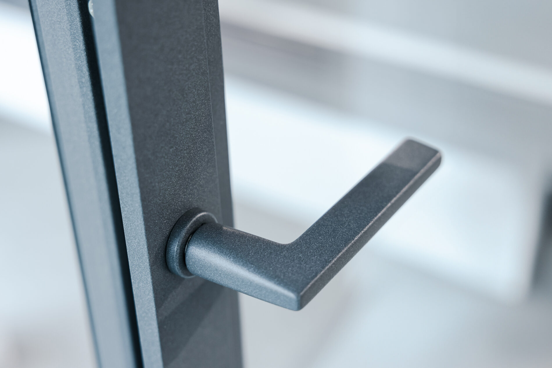 La maniglia centrale dona equilibrio e personalità al design, mentre i profili sottili lasciano entrare più luce naturale, creando ambienti luminosi e accoglienti.