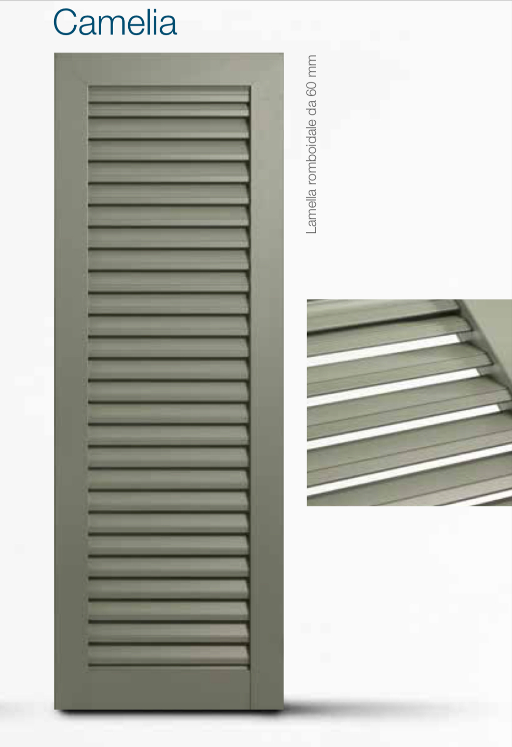 La persiana CAMELIA è realizzata con lamelle romboidali fisse da 60 mm in posizione inclinata. Le lamelle sono separate tra loro da appositi distaziali in alluminio che garantiscono una maggior sicurezza ai tentativi di effrazione. Grazie alle sue caratteristiche, la persiana Camelia è ideale sia nelle nuove costruzioni, sia nei vecchi borghi che nelle zone di campagna.